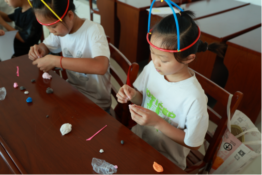 同一时间,曹武村的志愿者和孩子们一起动手用吸管搭出想要的物品,一个帽子,一栋房子,孩子们脑洞大开,小小的吸管发挥着巨大的作用。